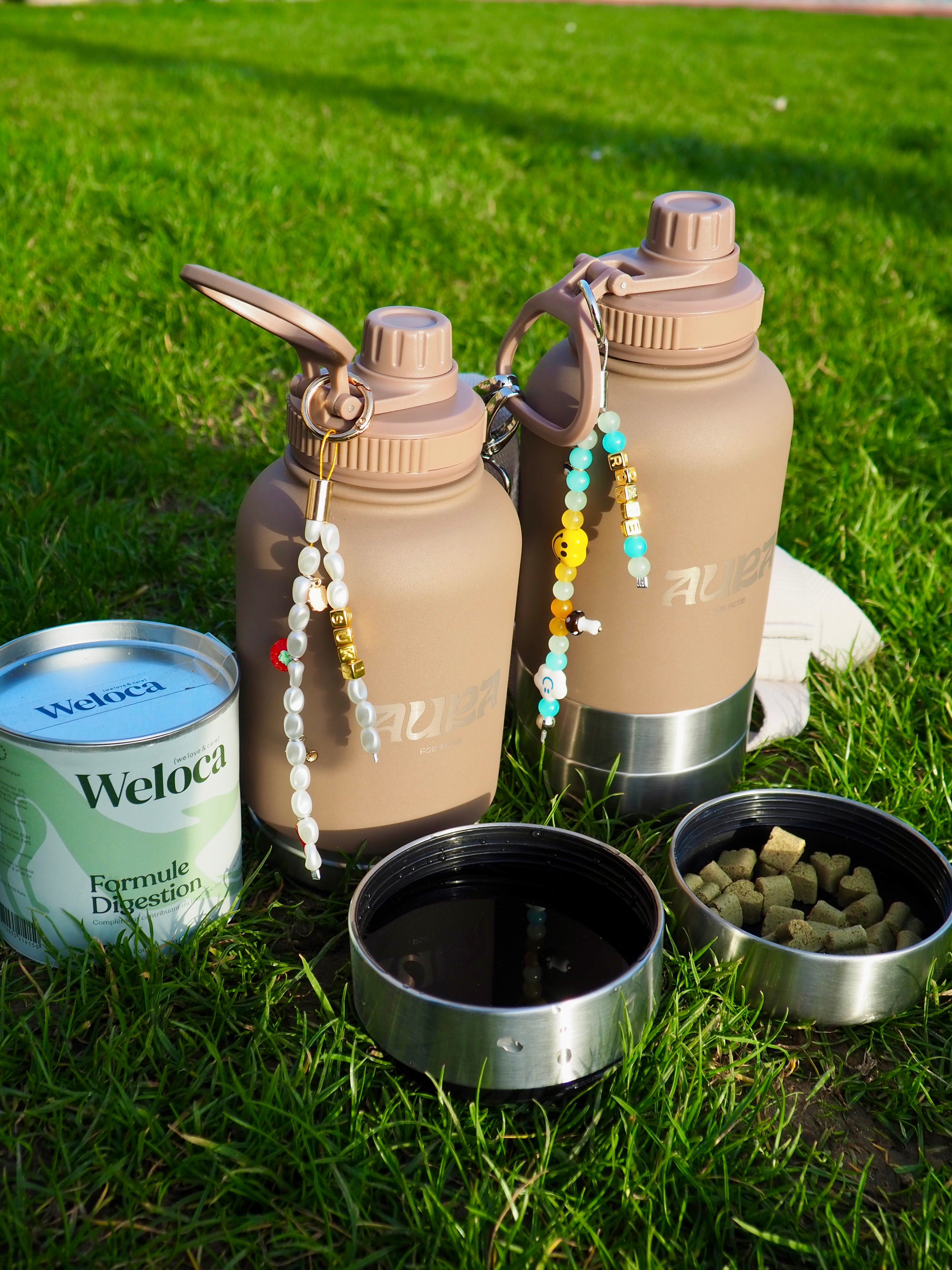 Offrez-vous une gourde à partager pour les balades et les voyages avec votre chien. Une gourde 3-en-1 vendue avec son bijou Aura personnalisé !