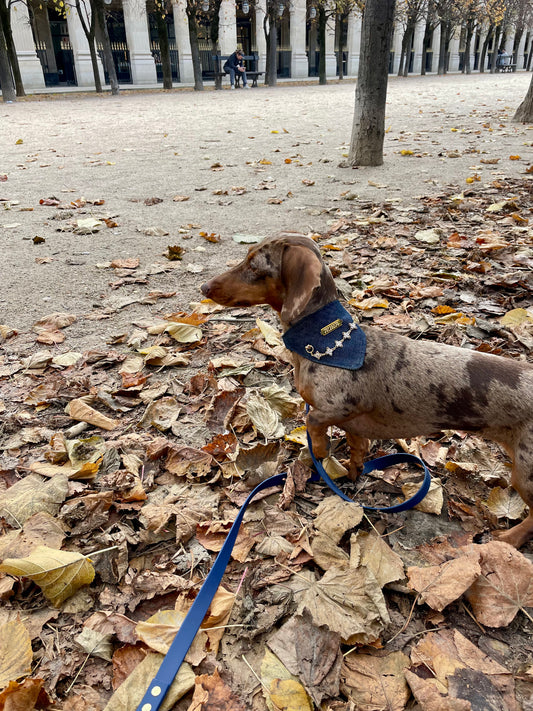 Découvrez le pack bandana en jeans + collier en biothane Navy Oscar&co. Possibilité d'ajouter la laisse en plus !