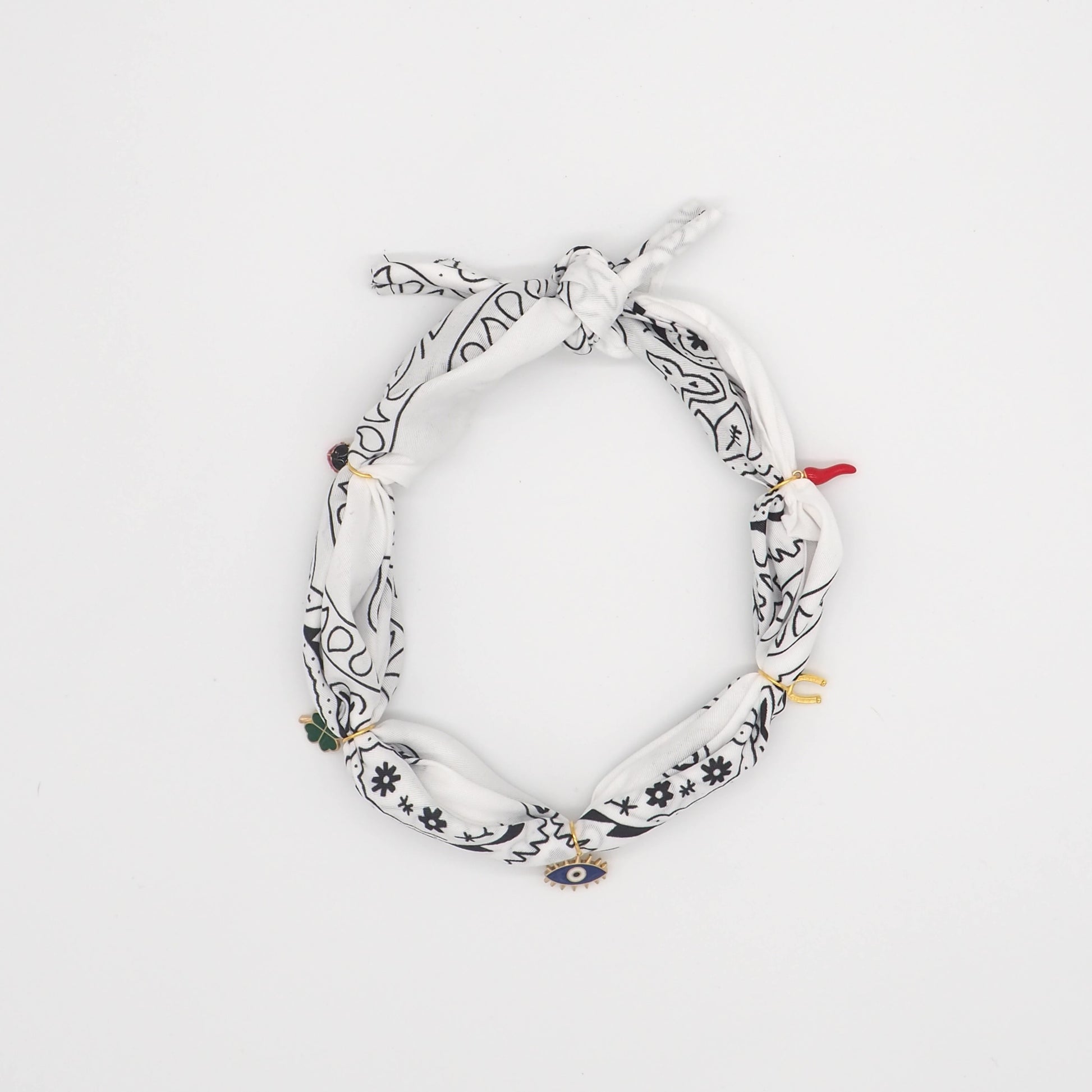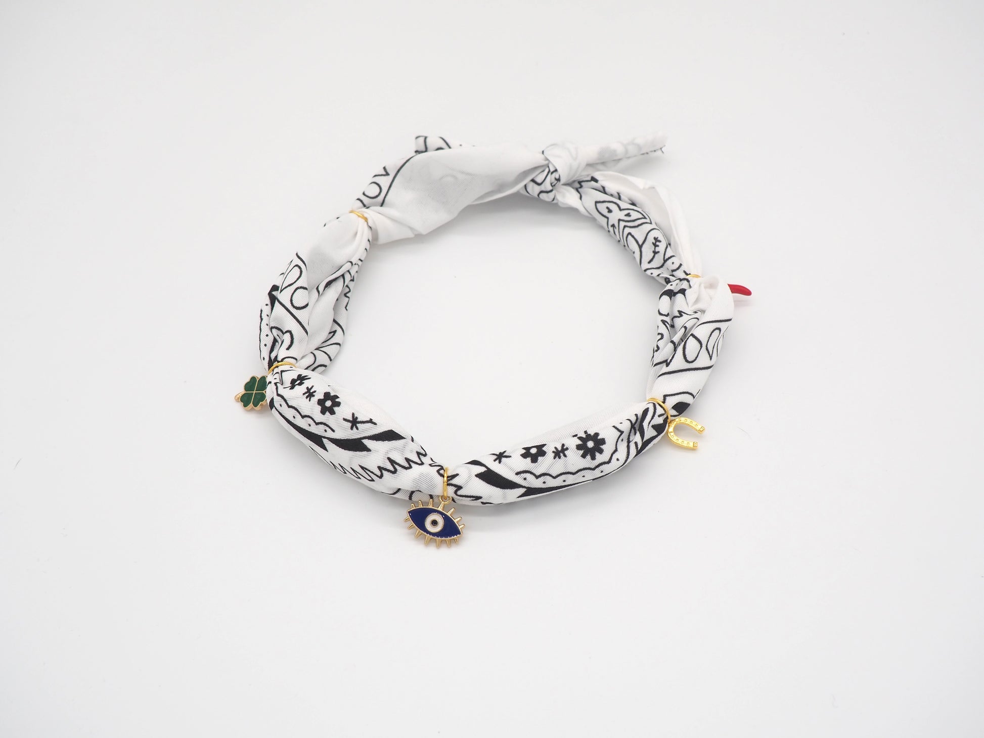 This white tie-on collar will be your pet's lucky charm! This rolled bandana is adorned with protective charms that, hopefully, will bring your pet good luck: a four-leaf clover, a horseshoe, a ladybug, or even an Eye of Horus. Other charms complete this collar for a fun touch: a chili pepper and a smiley face! A gold-patterned ring is located in its center, on which an initial can be hung. There is no clasp on this model; it simply ties around your pet's neck – or yours, because we already know you're going to steal it!