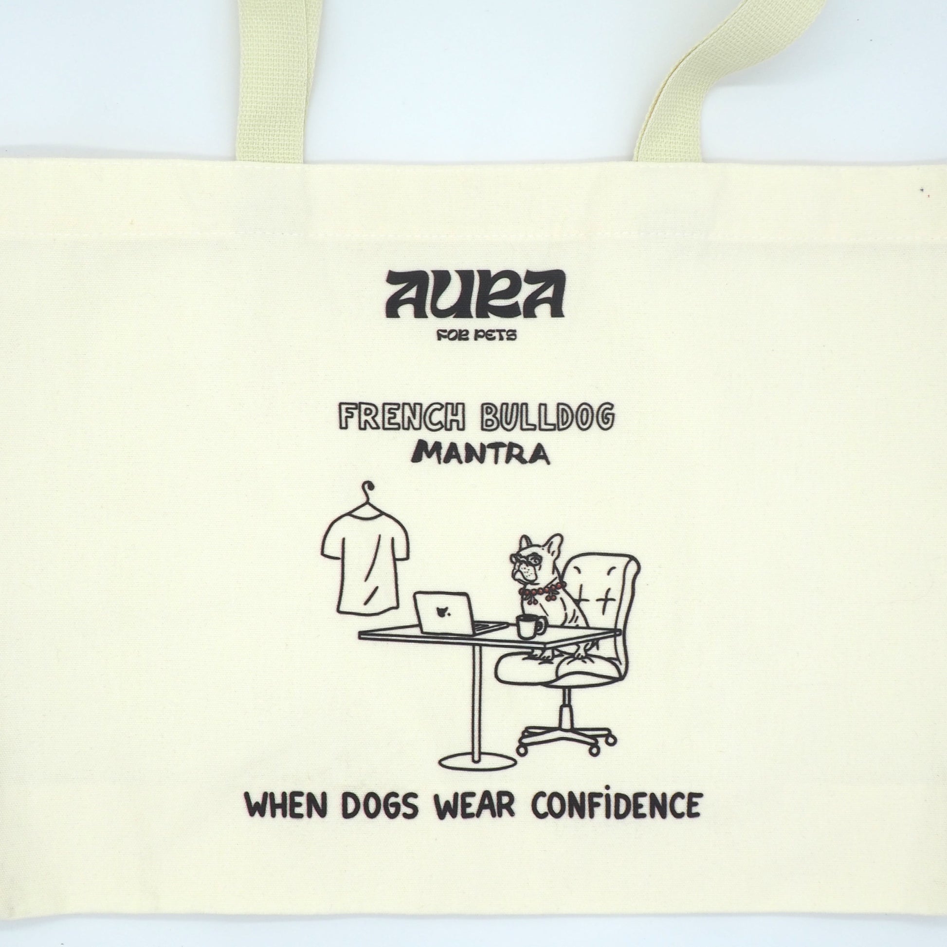 Off-white cotton tote bag with Bulldog Mantra print "When dogs wear confidence"