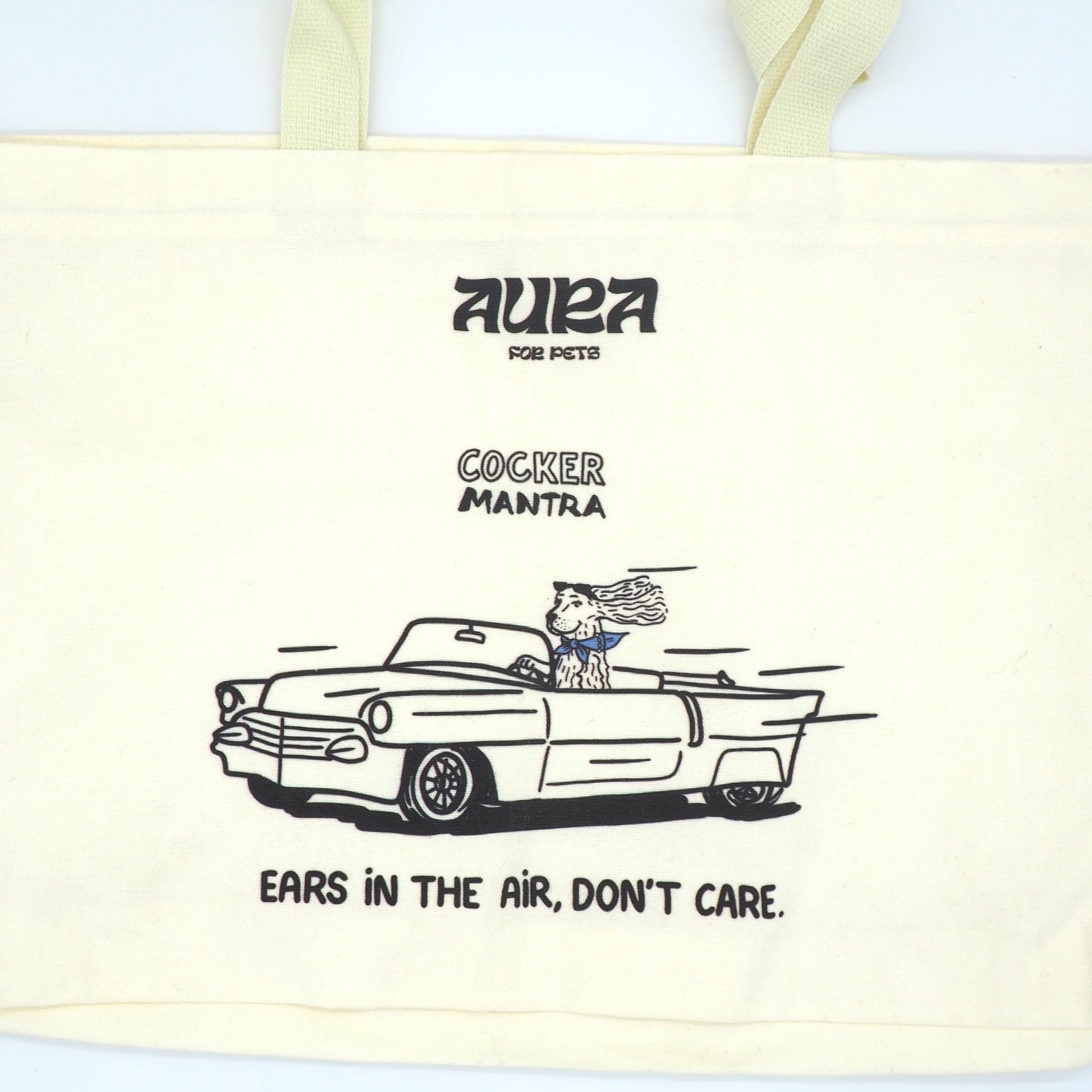 Off-white cotton tote bag with Cocker Mantra print "Ears in the air, don't care"