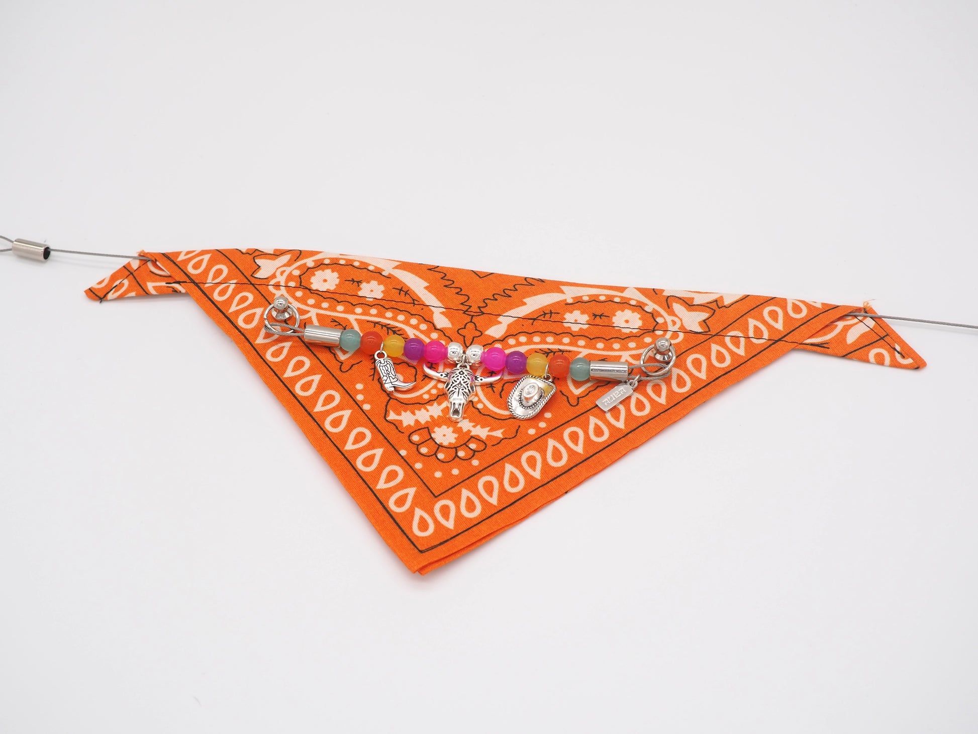 A l'aide d'une pince ou de vos doigts, écarter légèrement les anneaux des 2 côtés pour retirer le collier de perles. Retirer également le fil avec l'attache, en le faisant glisser d'un côté. Mettre le bandana à tremper dans une eau tiède savonneuse pendant 15 minutes. Frotter les tâches avec un savon blanc, rincer et essorer. Une fois le bandana sec, remettre le fil et le collier de perles sur le bandana.