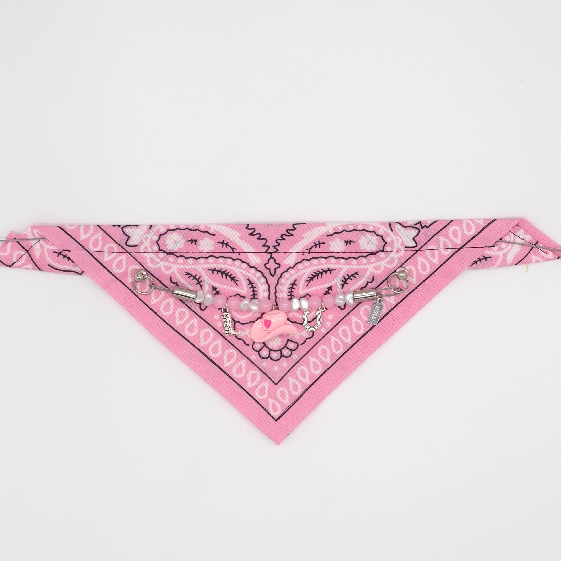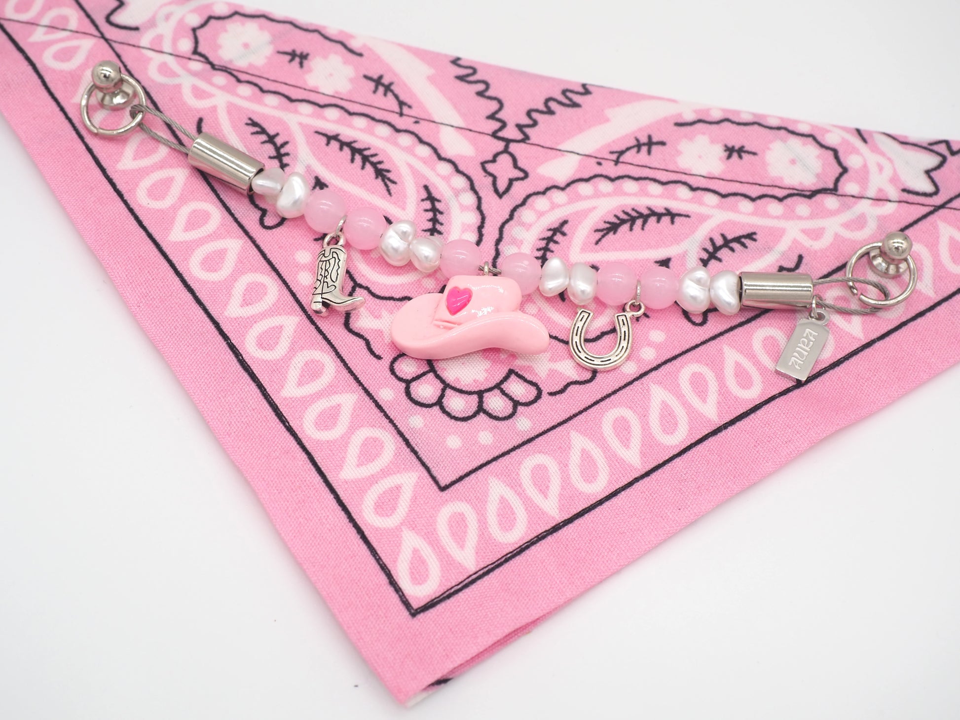 ジュエリーのようなデザインのこの犬用首輪は、パールビーズ、洗練されたチャーム、そしてバンダナのロックなエッジを組み合わせたデザインです。パウダーピンクのスカーフが、ワイルドウェストのヒロインのように、ガーリーでありながらもクールな雰囲気を添えています。