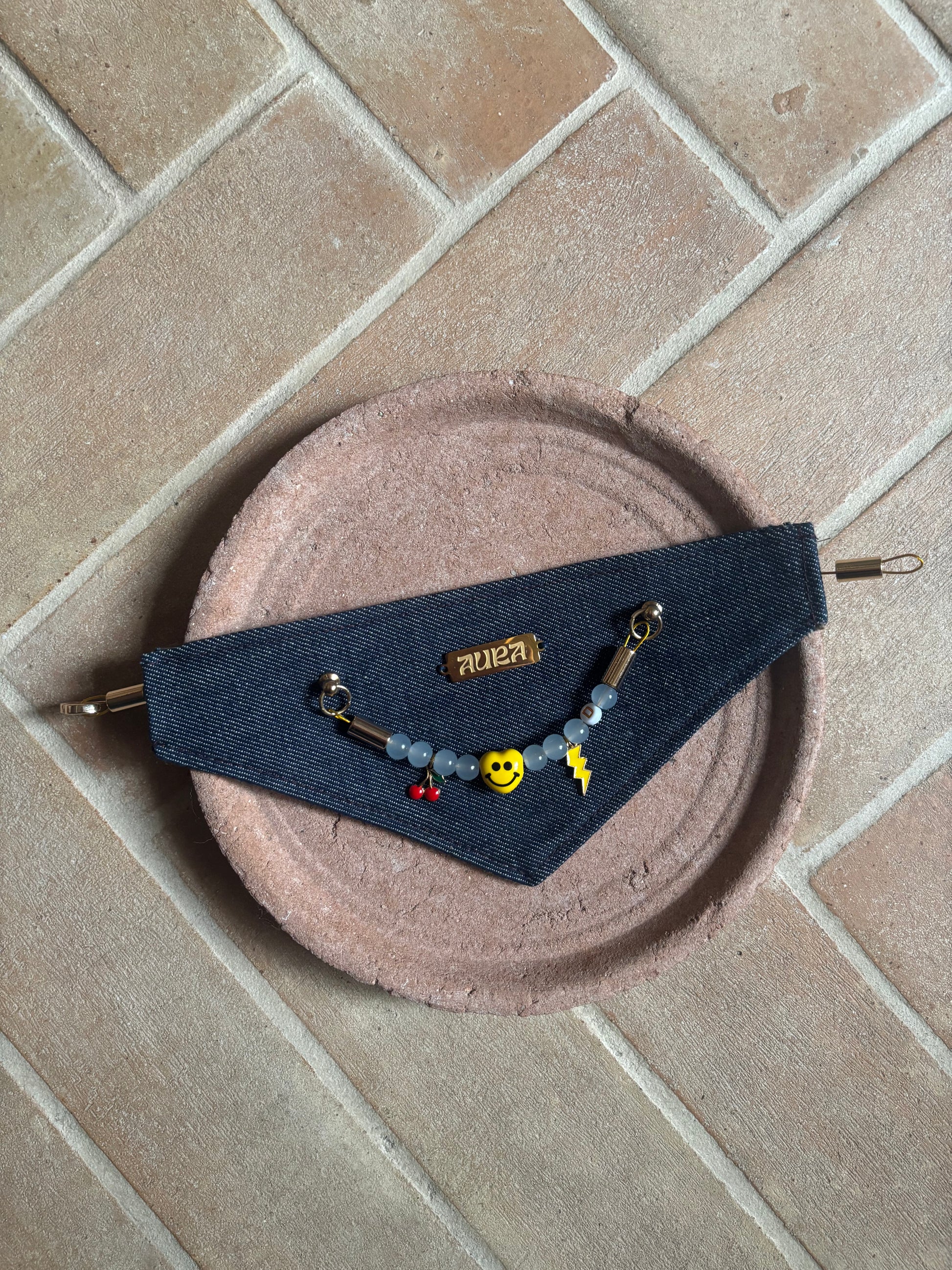 Un bandana en jeans brut, réalisé à la main à partir de chutes de tissus sourcés au cœur des marchés de tissus parisiens, sur lequel est fixé un collier de perles. Ce modèle reprend tous les codes de la tendance de cette saison FW25 : du jeans brut, des perles et un smiley jaune pour un look Cool Kid assuré. Votre chien devient le plus stylé du quartier !