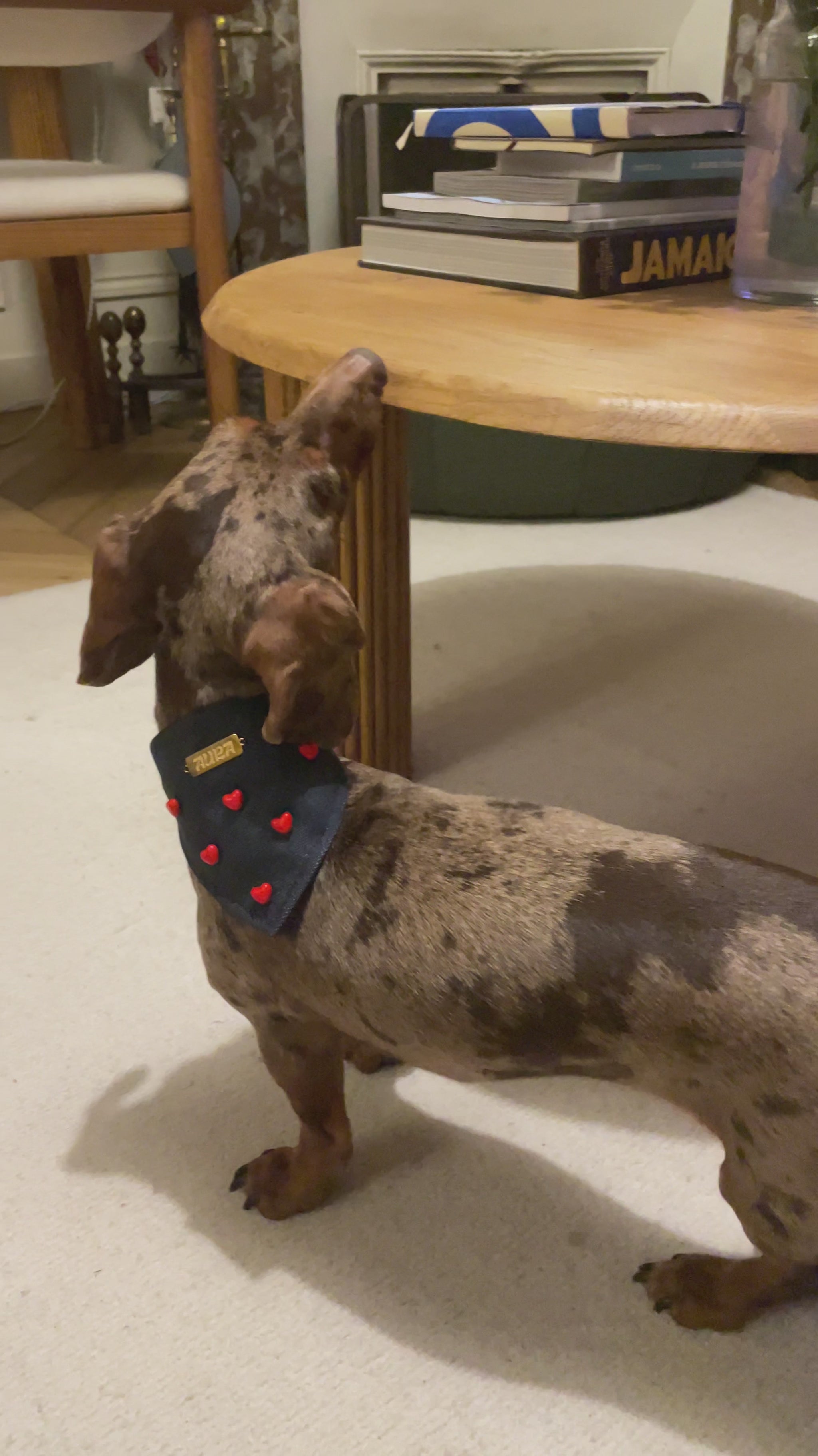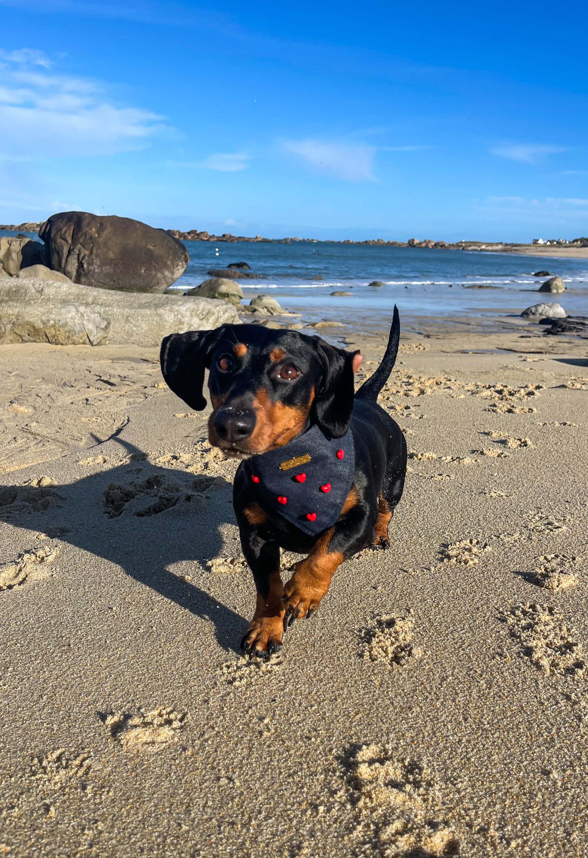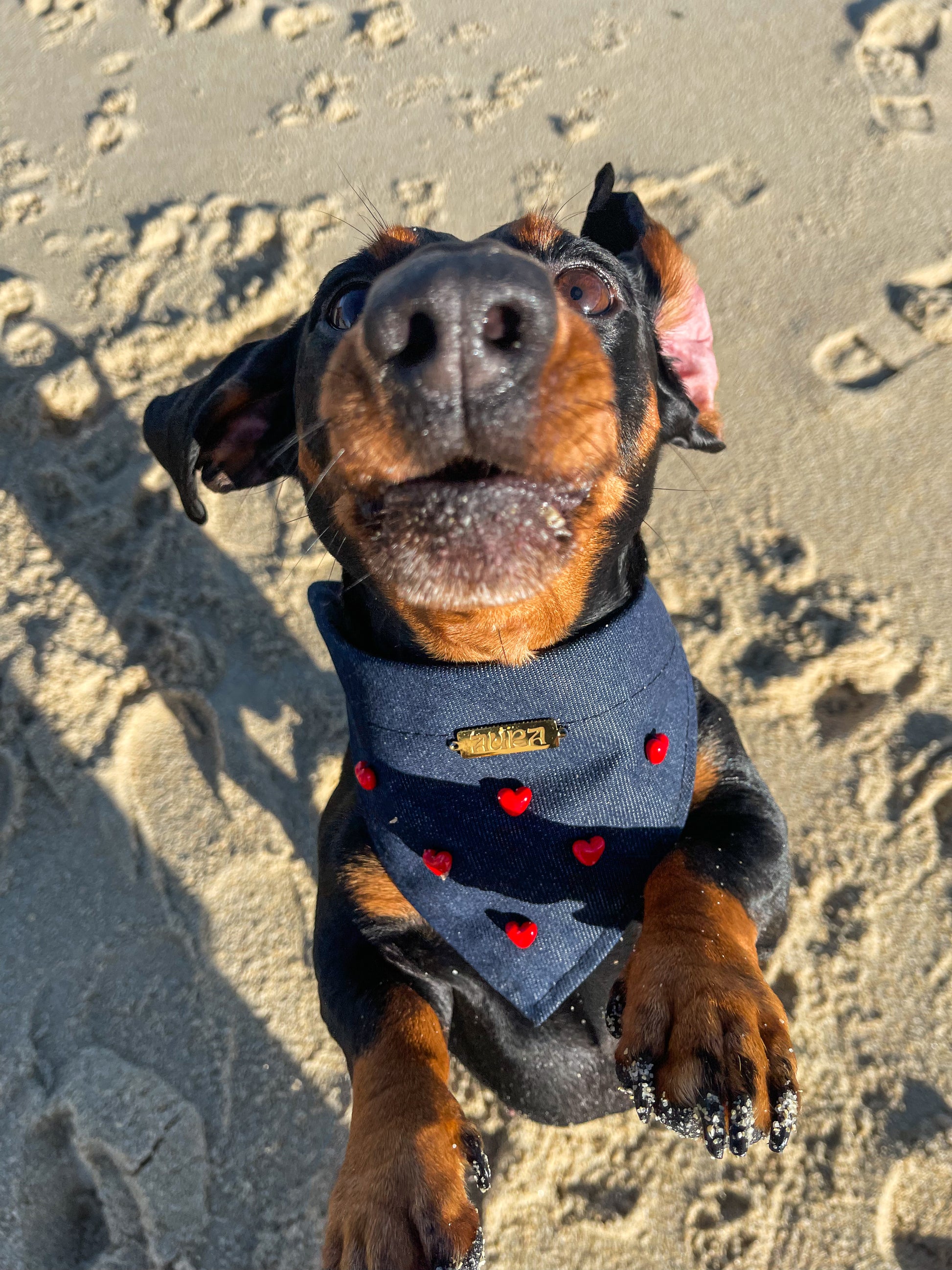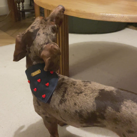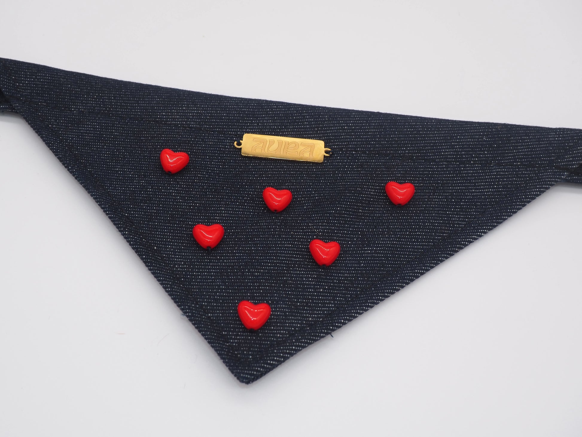 Notre modèle de bandana Cupidon en jean brut sublimera vos chiens les plus mignons, mâles ou femelles. Surmonté de coeurs rouges, cousus directement sur le bandana, il confère un style craquant à tous nos petits coeurs à 4 pattes. Le rouge des perles coeur se marie à merveille avec le jean brut, tout en y apportant du relief. Un accessoire unique et original !