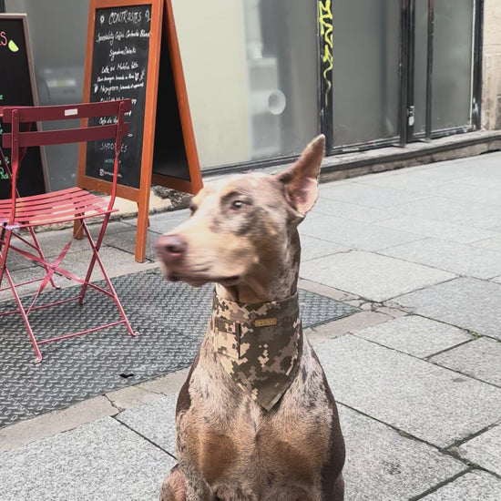 Notre modèle de bandana Ranger sublimera vos chiens les plus stylés ! Cet imprimé camouflage pixelisé dans les tons kakis est une pièce forte. Avec sa fausse poche cousu à l'avant, il s'inspire du treillis militaire. Un côté uniforme, très mode et effortless. Le tissu imperméable et déperlant vous permettra de lui mettre même par temps pluvieux !