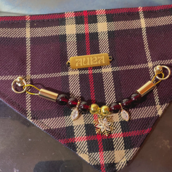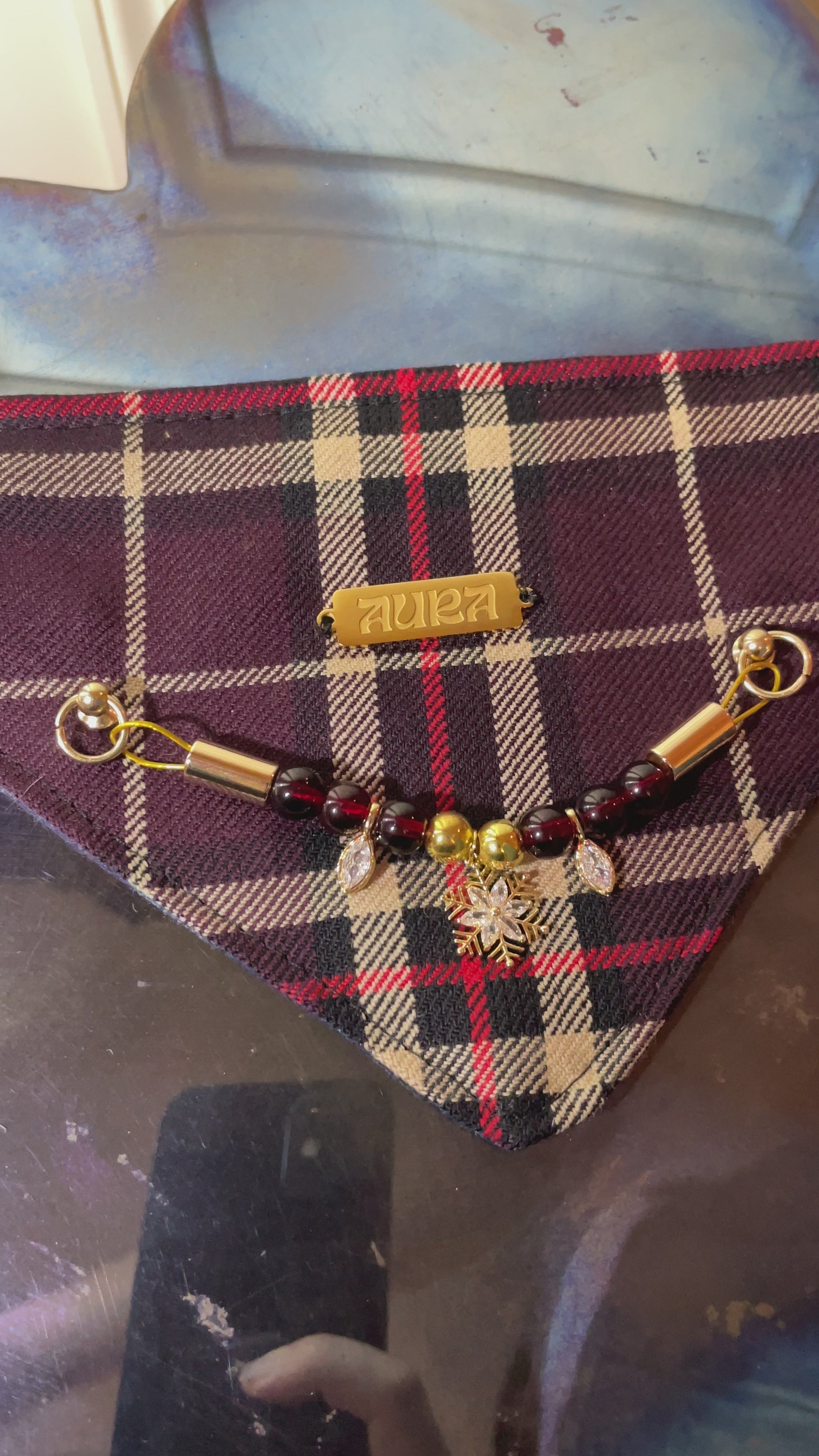 Le Tartan Bijou est un bandana d’exception qui réunit l’élégance intemporelle du tartan écossais et le raffinement d’un bijou. Confectionné dans un tissu premium bordeaux, beige et rouge, il est sublimé par une chaîne décorative de perles bordeaux et dorées, agrémentée de charms scintillants pour une allure chic et festive.