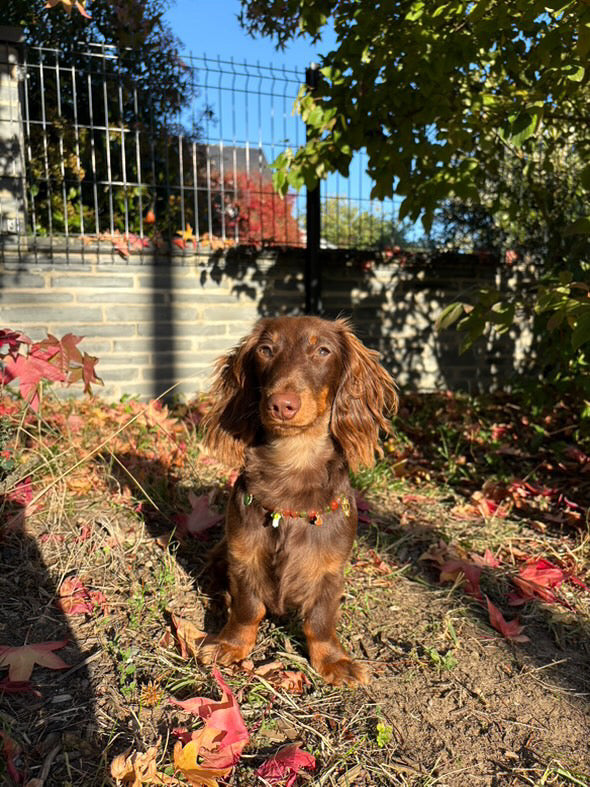 Toutes les couleurs de l'automne, réunies dans un collier. Un dégradé de vert kiwi, beige et orange sanguine, monté sur un fil doré, avec une sélection minutieuse d'adorables charms. Le collier Fall in Love est le parfait allié pour rentrer dans l'automne avec style. Coloré et élégant, il se mariera avec un grand nombre de harnais / laisses. LE détail qui ne laissera personne indifférent.